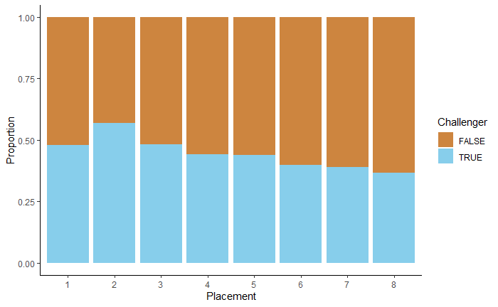 Using logistic multilevel modeling, I predicted whether or not a player is Challenger based on player end-of-game variables such as placement, gold leftover, and board cost. Exploratory analysis shows that Challenger players tended to place higher than non-Challenger players (as expected), leading me to believe that placement would be an important variable.