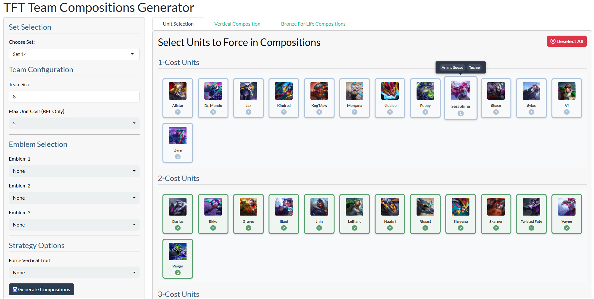 The vertical composition generator is meant to be used in games where you have a trainer golem or wandering trainer, in other words you have multiple emblems and you want to go deep into one trait or origin. On the other hand the bronze for life generator is meant for the opposite situation where you want to maximize the amount of non-unique traits or origins active like when you have the augment bronze for life or trait tracker.